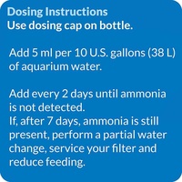 Use the API Dosing Cap on the Bottle. Add 5ml per 38L of aquarium water. Continue to add AMMO-LOCK every 2 days until ammonia is not detected. If, after 7 days, ammonia is still present, perform a partial water change, service your biological filter and reduce feeding.