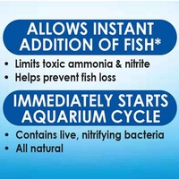 Use when starting a new aquarium, adding new fish, changing water, changing filter media, after medicating, or whenever ammonia or nitrite are detected. Allows instant addition of fish. Limits toxic ammonia and nitrite. Helps prevent fish loss. Immediately starts aquarium cycle. Contains live, nitrifying bacteria. No refrigeration required. All natural.