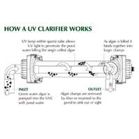 To be more precise, the green water algae contained within the pond water is drawn into the UVC via a suitably sized pond pump. The UV lamp, located within a quartz sleeve, allows the UV light to penetrate the pond water as it flows through the casing. This UV light kills the single celled algae and as a result binds it together to form larger clumps. These algae clumps will then be removed from the water by a suitably sized pond filter.