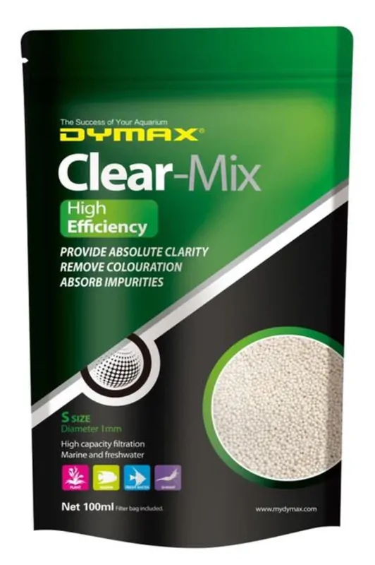 Dymax Clear-Mix is a unique macro-porous synthetic polymer absorbent that removes soluble and insoluble impurities and colouration from water, due to the presence of drift wood or feeding, at a rate and capacity exceeding 5 times that of any other filtration products in the market. This product controls ammonia, nitrites and nitrates by removing nitrogenous organic waste that would otherwise release these harmful components.