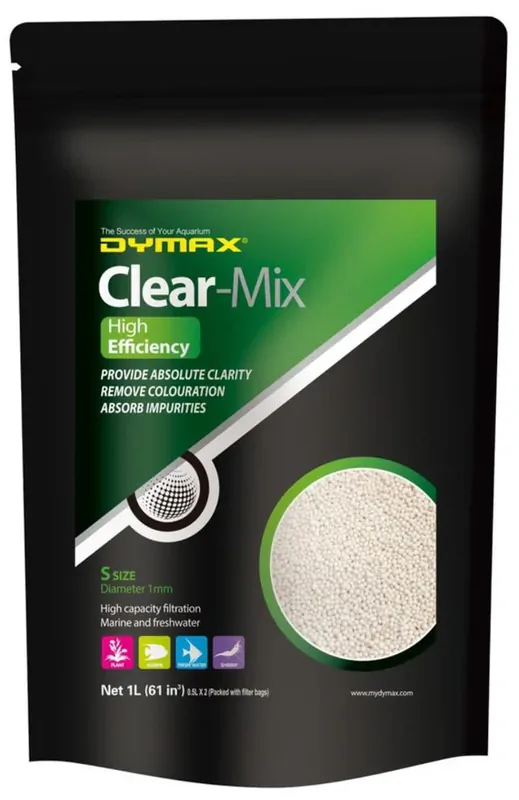 Dymax Clear-Mix is a unique macro-porous synthetic polymer absorbent that removes soluble and insoluble impurities and colouration from water, due to the presence of drift wood or feeding, at a rate and capacity exceeding 5 times that of any other filtration products in the market. This product controls ammonia, nitrites and nitrates by removing nitrogenous organic waste that would otherwise release these harmful components.