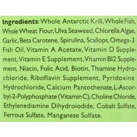 Typical Ingredients: Whole Antarctic Krill, Whole Herring, Whole Wheat Flour, Algae, Beta Carotene, Spirulina, Garlic, Vegetable and Fruit Extract, Vitamin A Acetate, Vitamin D Supplement, Vitamin B12 Supplement, Vitamin E Supplement, Riboflavin Supplement, Folic Acid, Niacin, Biotin, Calcium Pantothenate, Pyridoxine Hydrochloride, L-Ascorbyl-2-Polyphosphate (Stable C), Ethylenediamine Dihydroiodide, Cobalt Sulfate, Ferrous Sulfate, Manganese Sulfate, Choline Chloride.