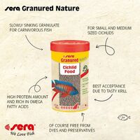 Sera Granured Nature is the staple food consisting of gently manufactured granules without dyes and preservatives for mainly carnivorous, smaller cichlids and omnivores.