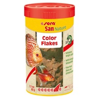 Sera San Nature is a colour enhancing tropical fish food without dyes and preservatives for all ornamental fish eating at the water surface.